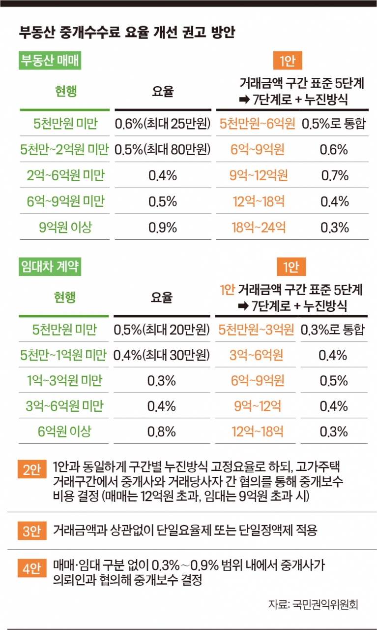 권익위는 지난 2월 9일 ‘주택중개보수 요율체계 및 중개서비스’ 제도개선 방안을 국토교통부와 전국 17개 광역자치단체에 권고했다고 밝혔다. 권익위가 제안한 중개수수료 개편 권고안은 크게 네 가지로 압축된다. 1안은 현행 5단계인 거래금액 구간 표준을 7단계로 세분화하고 구간별 누진방식 고정요율을 적용하는 것이다.