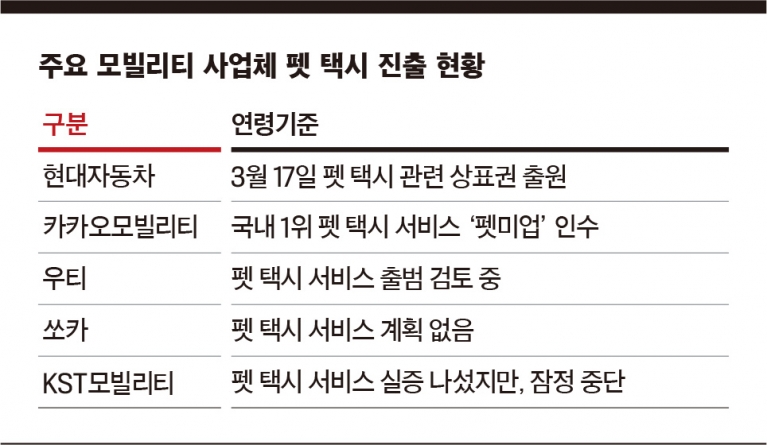 시장에서 주목받는 모든 플레이어가 펫택시 사업에 진출을 계획하고 있는 것도 아니다. 카카오모빌리티, 우티와 함께 모빌리티 서비스 주요 플레이어로 손꼽히는 쏘카 측은 “현재로선 펫 택시 사업 진출을 검토하고 있지 않다”며 “타다 라이트 등의 서비스에 집중하고 있다”고 말했다.